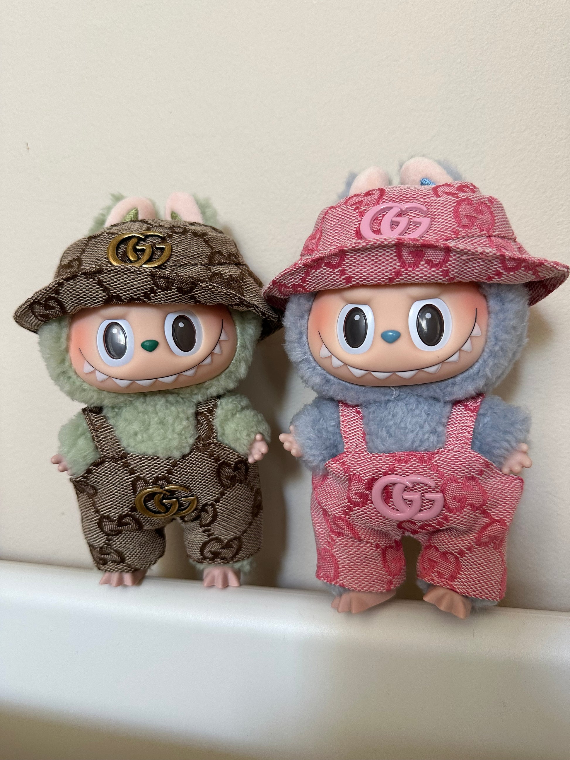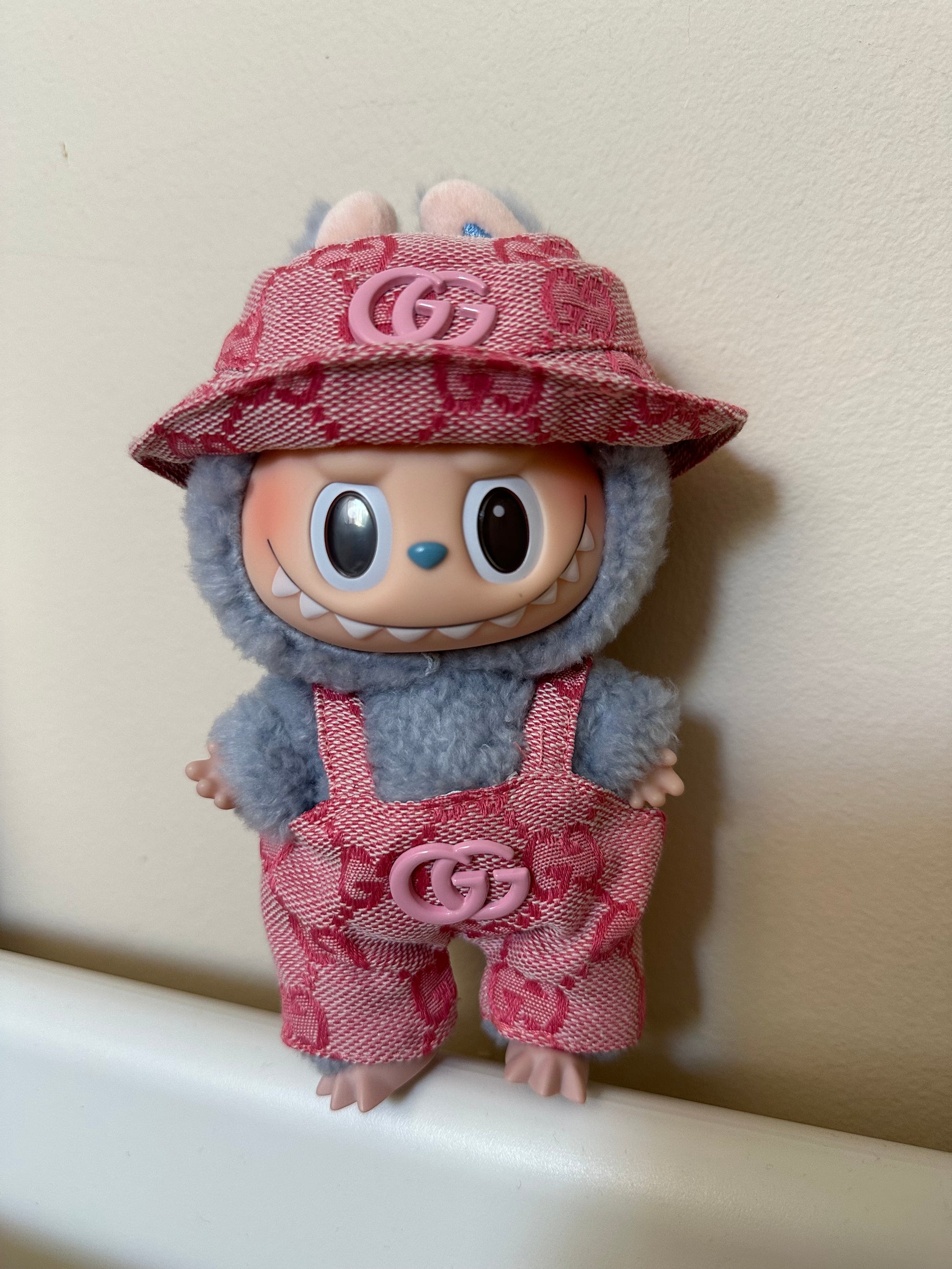 Gucci Pink Overalls outfit. Clothes are sold as 1 set, as pictured on each Labubu.